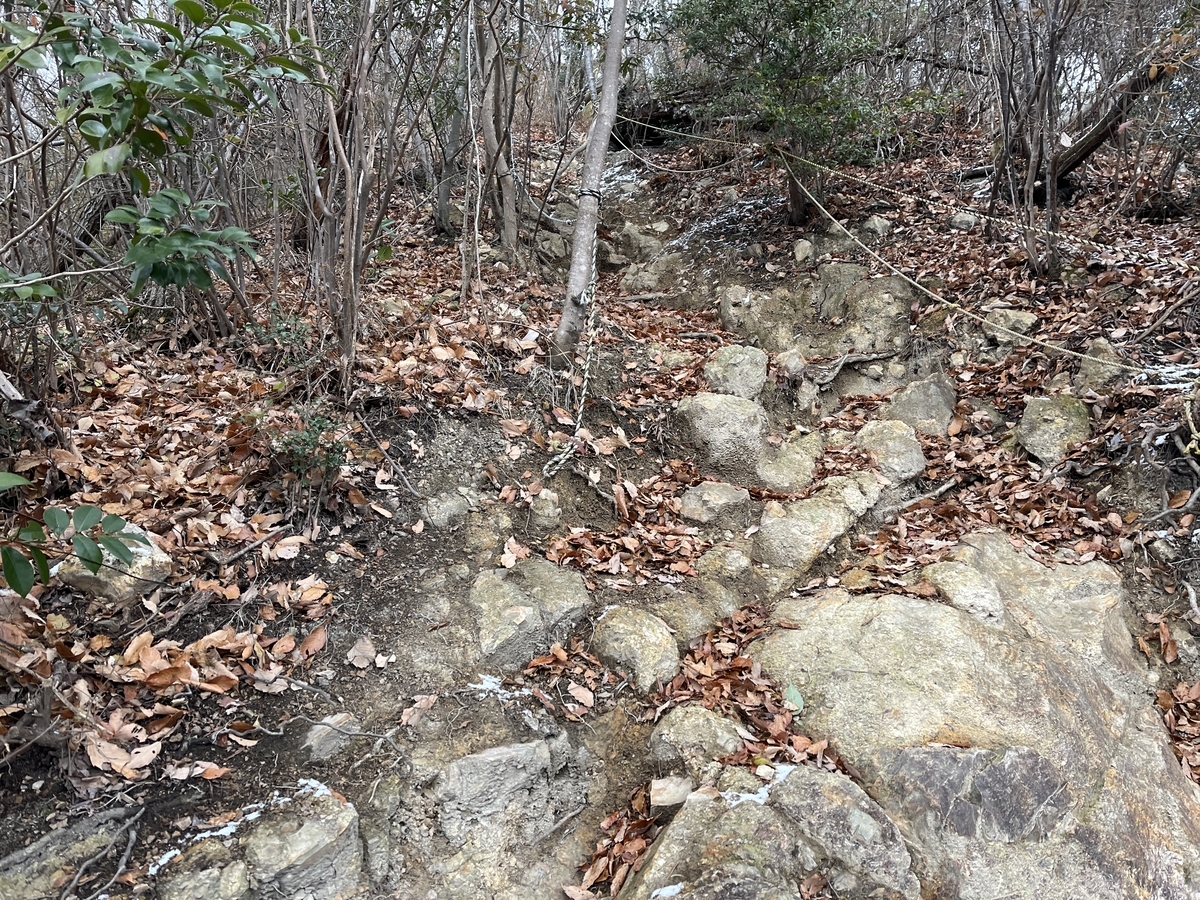 ふるさと公園と大岩からのルートと合流すると、落ち葉と岩で滑りやすい急登が出てきます。この地点は慎重に登ったほうが無難です。