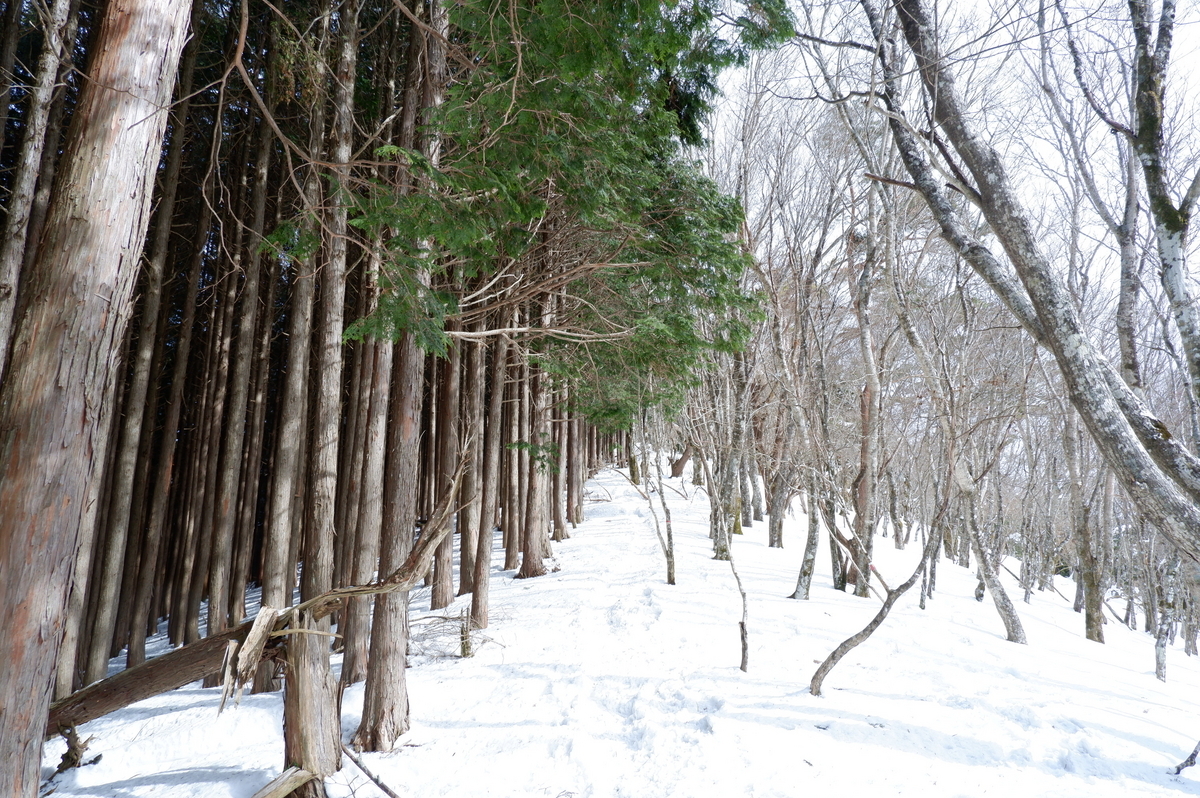 杉とブナが分かれる地点まで来ると観音峯山まであと少しです。