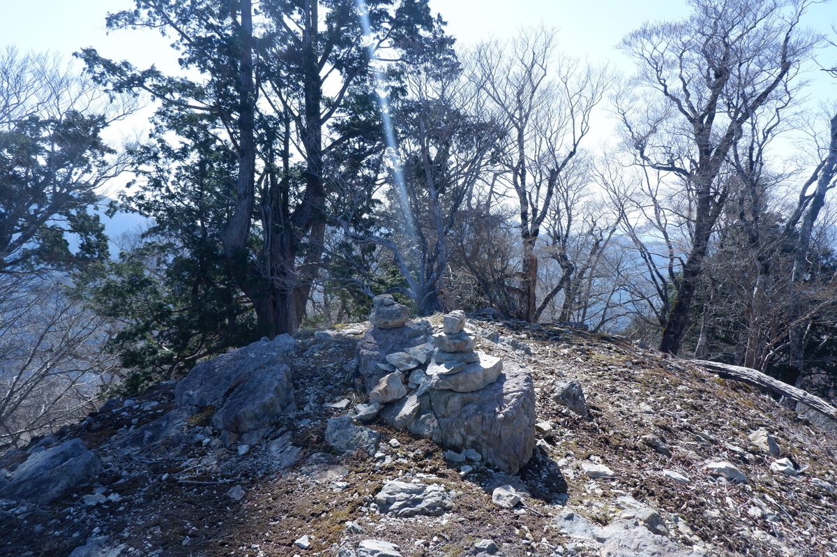 又剣山をあとにして1320m峰に向かいます。又剣山から少し進んだところに石を積んだ場所がありました。私はここを真っすぐ尾根を進みましたがルートミスでした。ここは左に曲がり下ってゆきます。