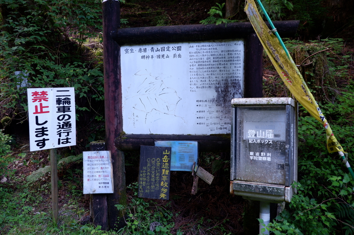 林道が狭くなる所まで来ると看板や登山ポストが見えてきます。