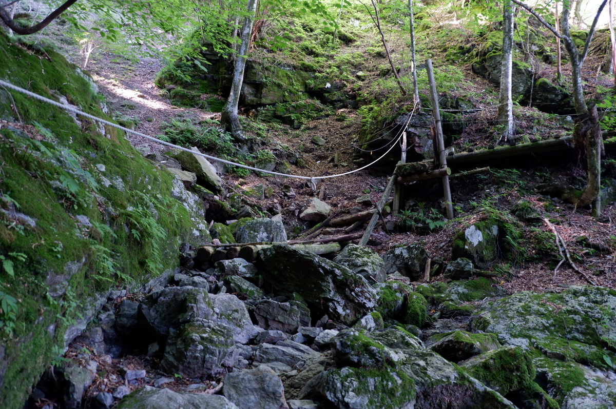 渡渉ポイントが何か所かありますが、ここが一番気を付けた方が良いと感じました。倒木から岩まで一気に行く必要があります。沢は意外と深いのでハマると登山靴でも水が入ってくると思います。