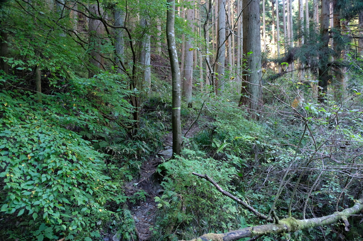 先ほどの分岐から100m程度進むと次の分岐に出ます。ここは左の沢に下りて行きます。