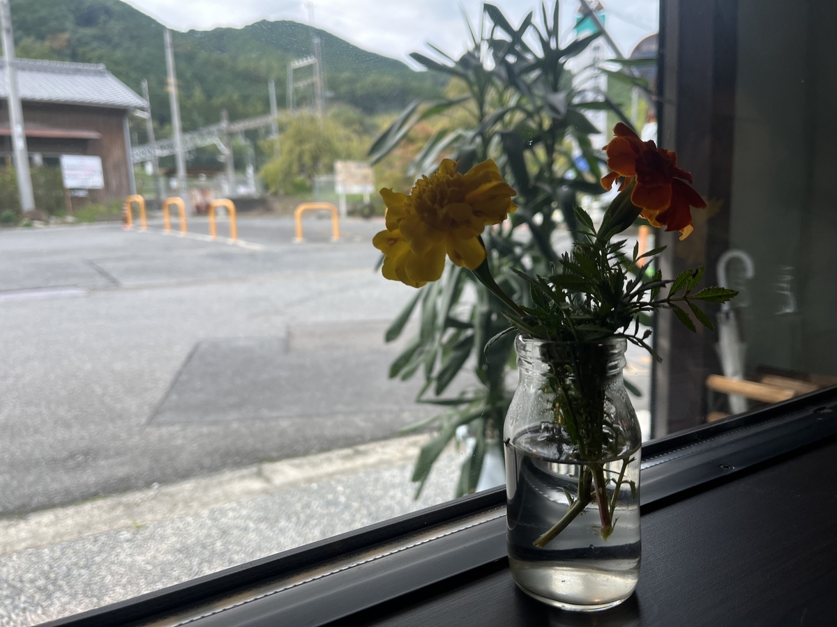 駅を眺めながらお茶できるのが良いのですが、窓際に置かれた花もキレイで花好きの妻はとても喜んでいました(^^♪
