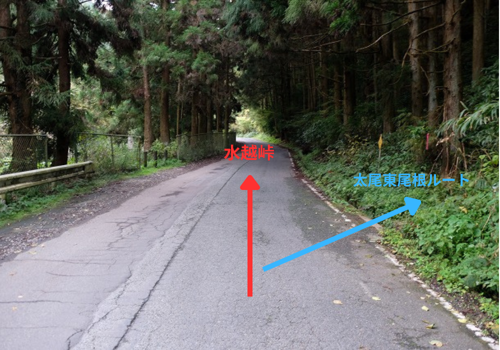 駐車場から旧国道309号線に出て少し歩くと右手に太尾東尾根ルートの登山口があります。